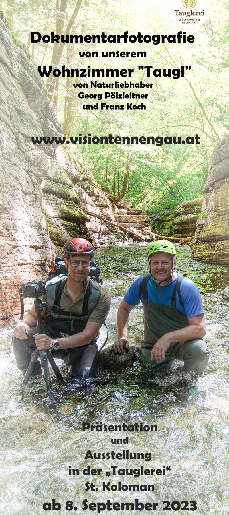 Die beiden Fotografen gehen nicht nur „normal“ wandern, sondern sie klettern, schwimmen und führen durch die engen Schluchten der Taugl; sie zeigen, wie eindrucksvoll die Natur hier auftritt – kristallklares Wasser, Felsplatten, tosendes Wasser, enge Klammabschnitte. Salzburger Nachrichten+1